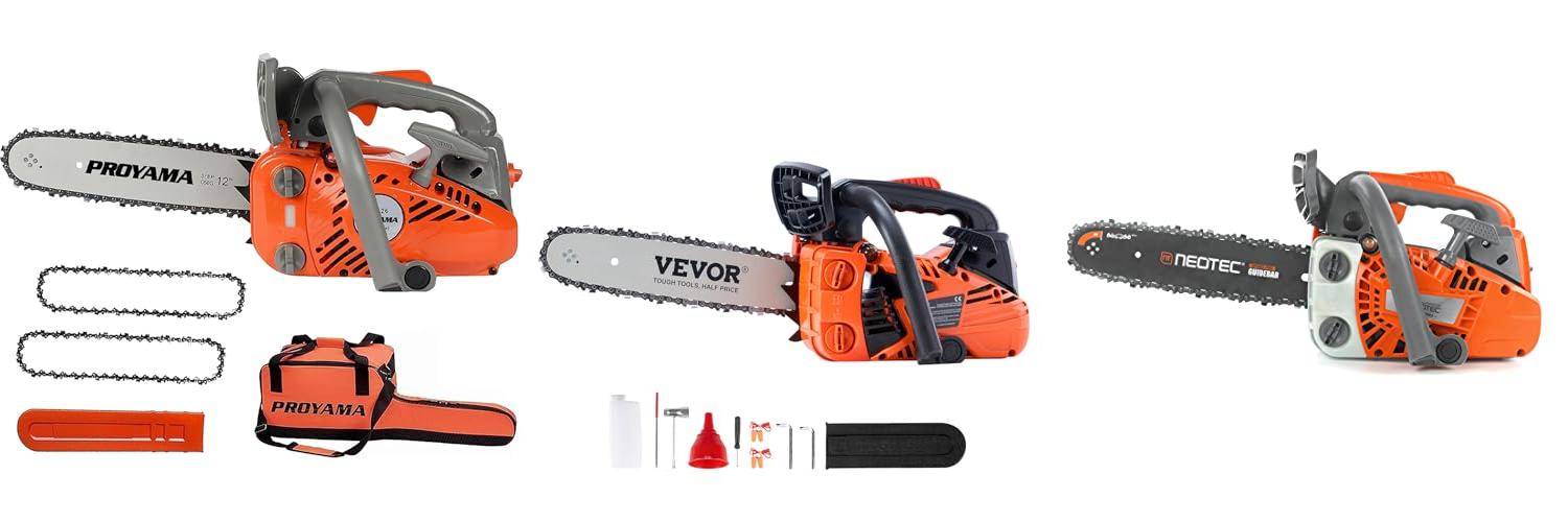 1. PROYAMA 26CC 2-Cycle Top Handle Gas Powered Chainsaw 12 Inch Petrol Handheld Cordless Chain Saw for Tree Wood Cutting with 2 chains(12inch)