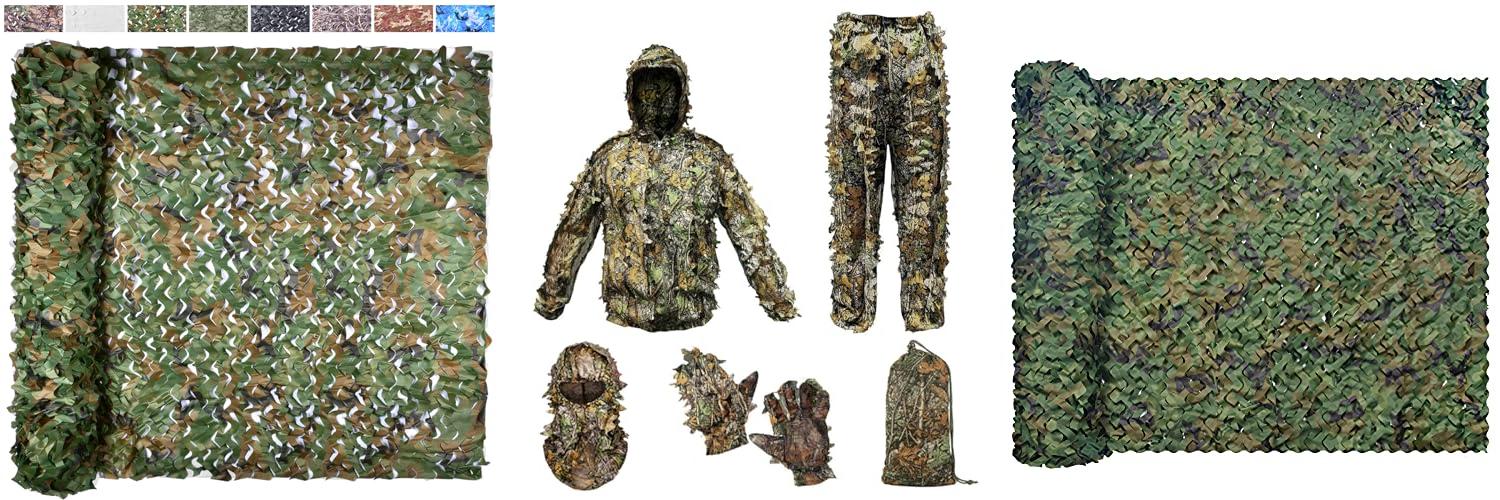 • The set includes everything you need: a hood, jacket, pants, a camouflage strap, and a storage bag.