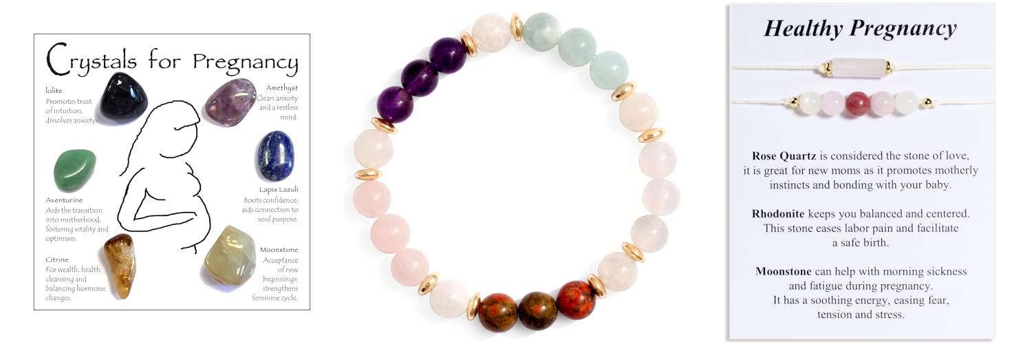 - It features 100% natural healing crystals like moonstone, unakite, amethyst, rose quartz, white agate, and aquamarine. These stones are believed to promote love, bonding, and protection during pregnancy.