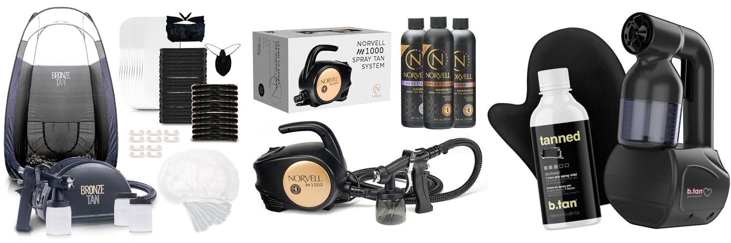 - Tent/Booth: A spray tan tent keeps your room clean. It catches extra mist.